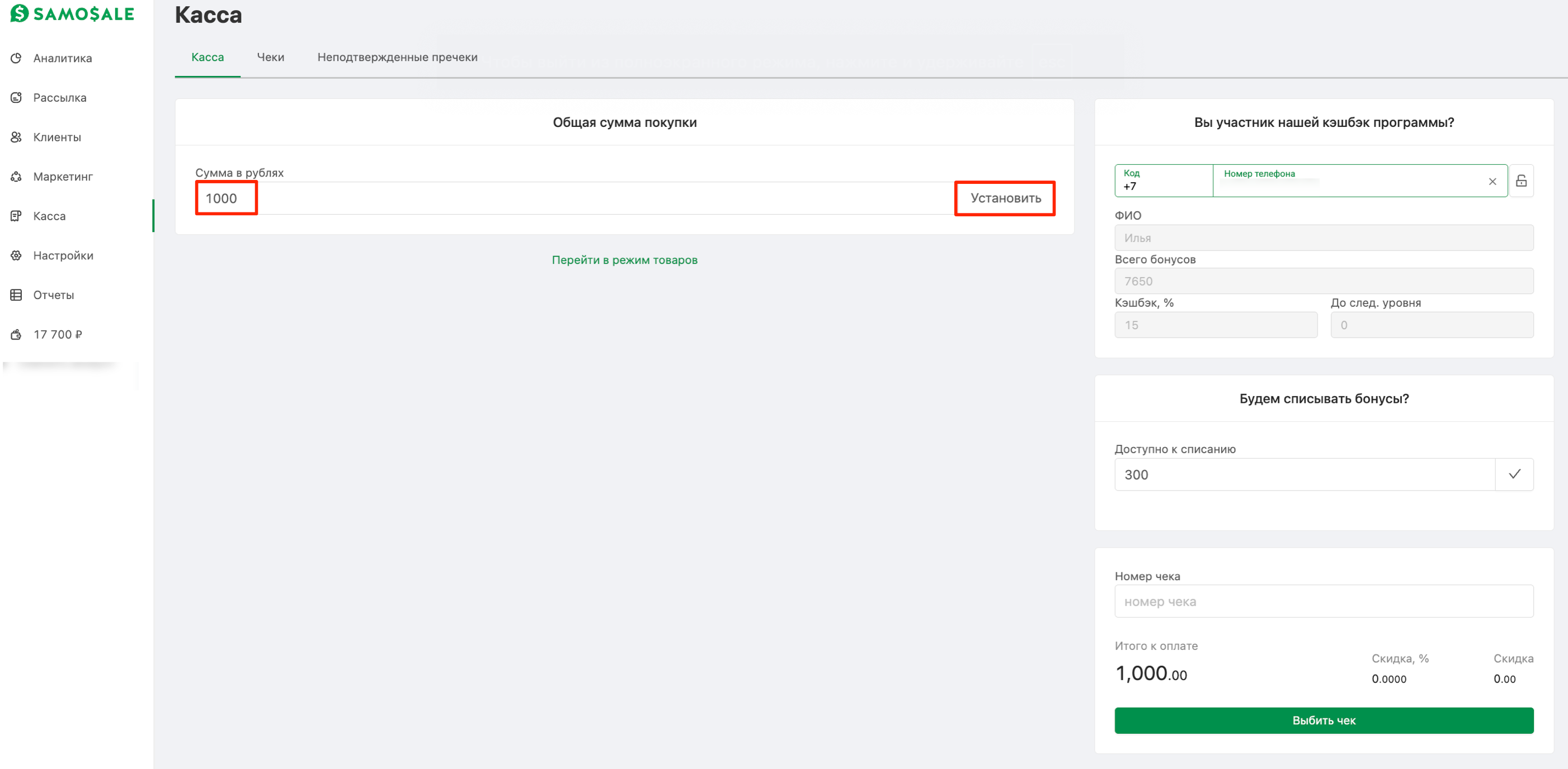 Введите номер телефона покупателя.