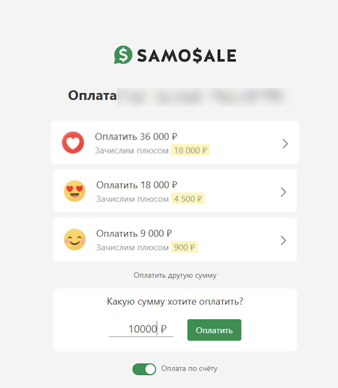 - При переключении на «Оплата по счёту» и выборе суммы — формируется счёт на указанную сумму с соответствующим бонусом.
