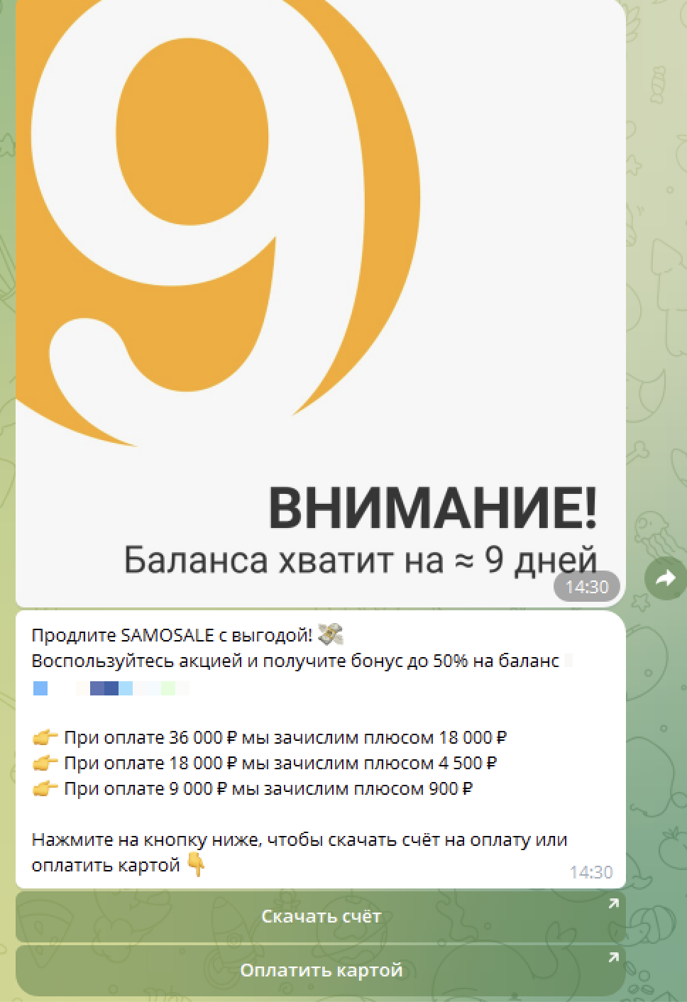 Если на балансе личного кабинета осталось средств менее чем на 10 дней работы, система автоматически отправит ответственному сотруднику напоминание в мессенджер. Это помогает избежать отключения основных функций личного кабинета