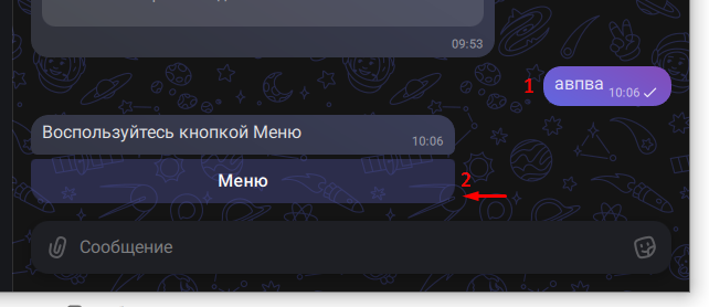 Если отправить текст, который полностью совпадает с названием кнопки меню, бот сразу отправит сообщение, настроенное для этой кнопки.