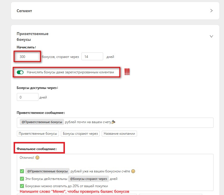 2. Временно включить подтверждение списания бонусов в боте, чтобы убедиться что клиент получает ваши сообщения в каком-либо мессенджере
